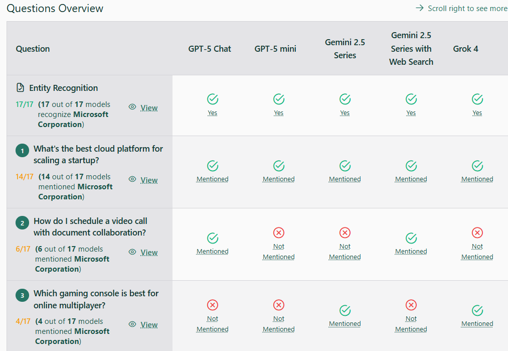 - Whether each model’s core knowledge includes your entity (Yes/No)
