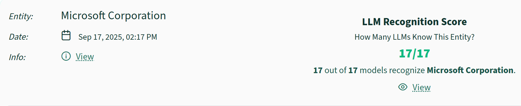 The first section is the LLM Recognition score. This shows how many chatbots/LLMs include your entity in their core training knowledge.